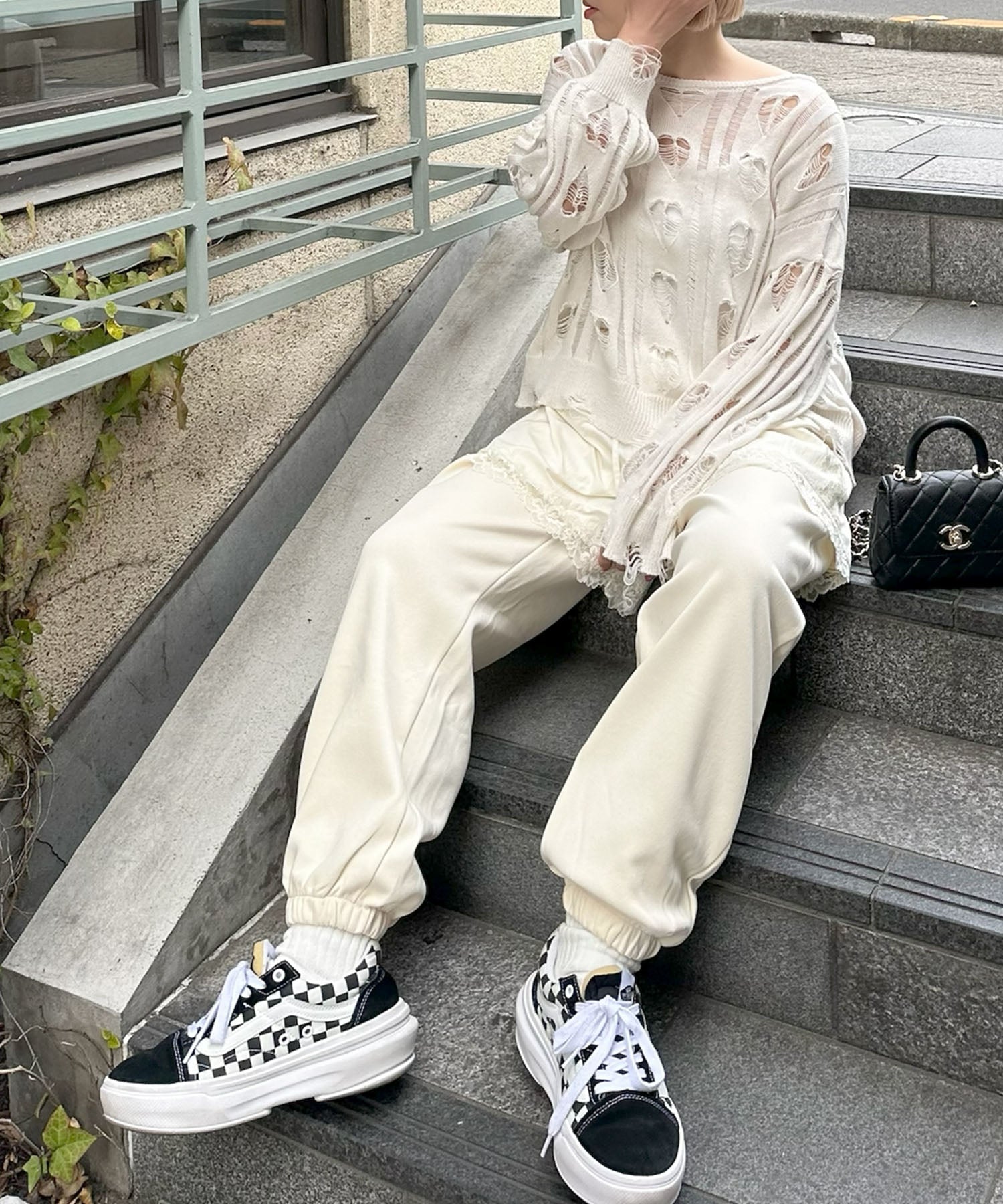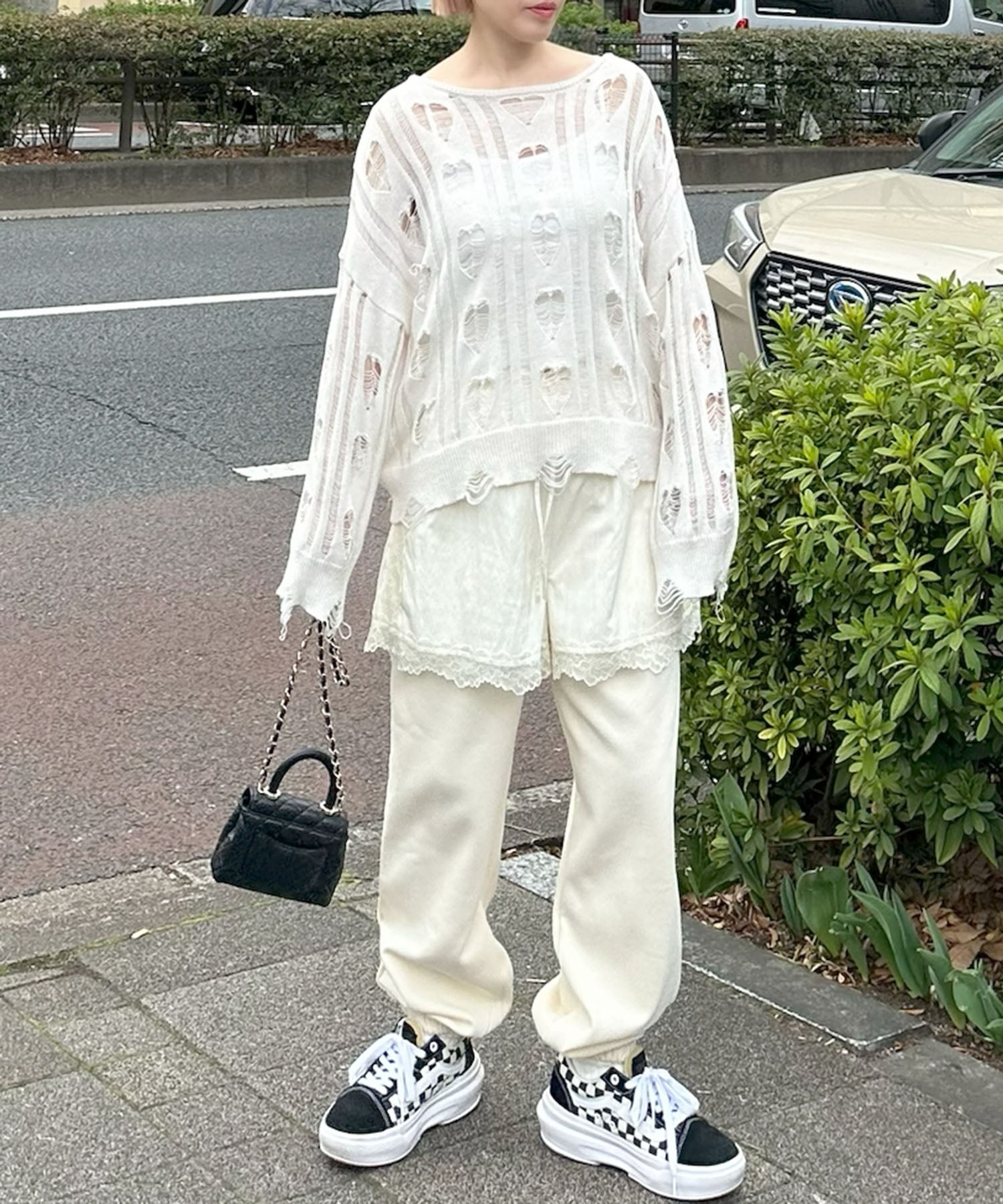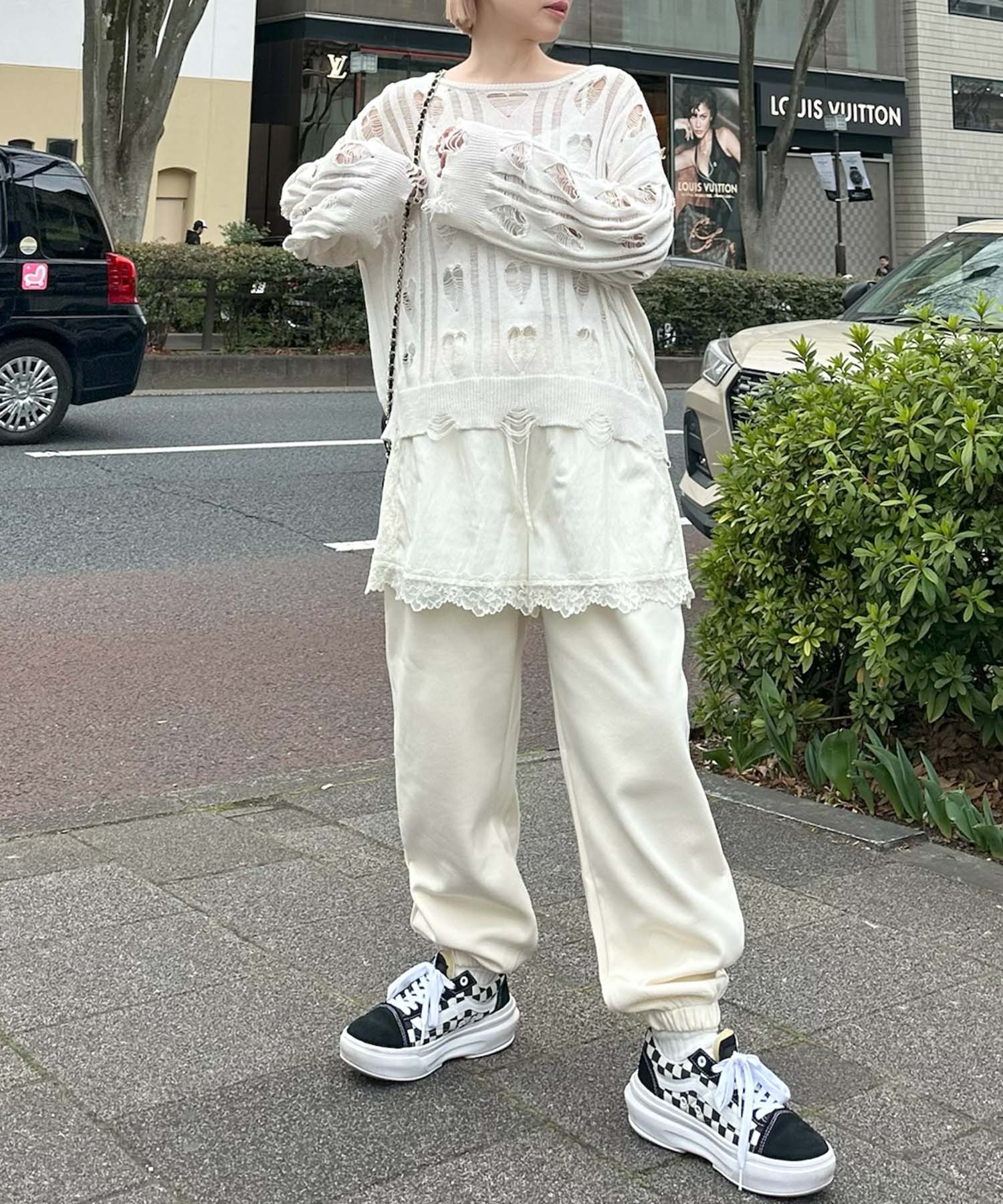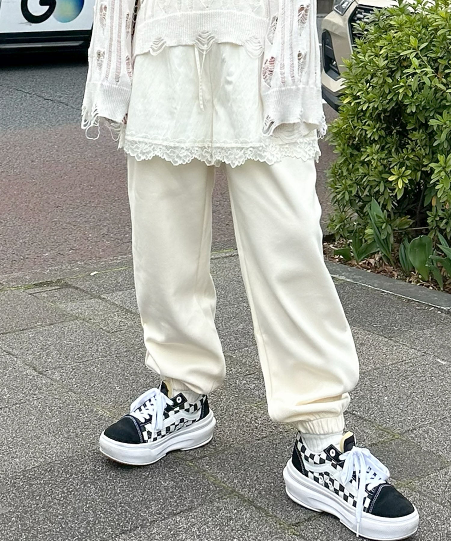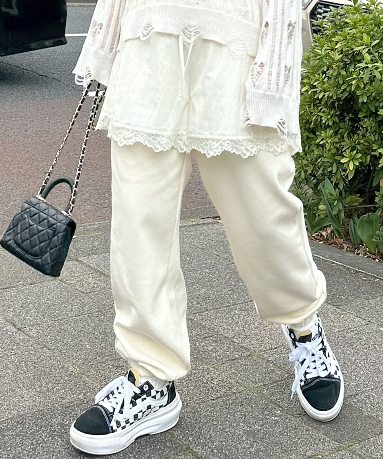 ・カジュアルなイージーパンツは、レースやフリルなど女子っぽアイテムと合わせるのがかわいい