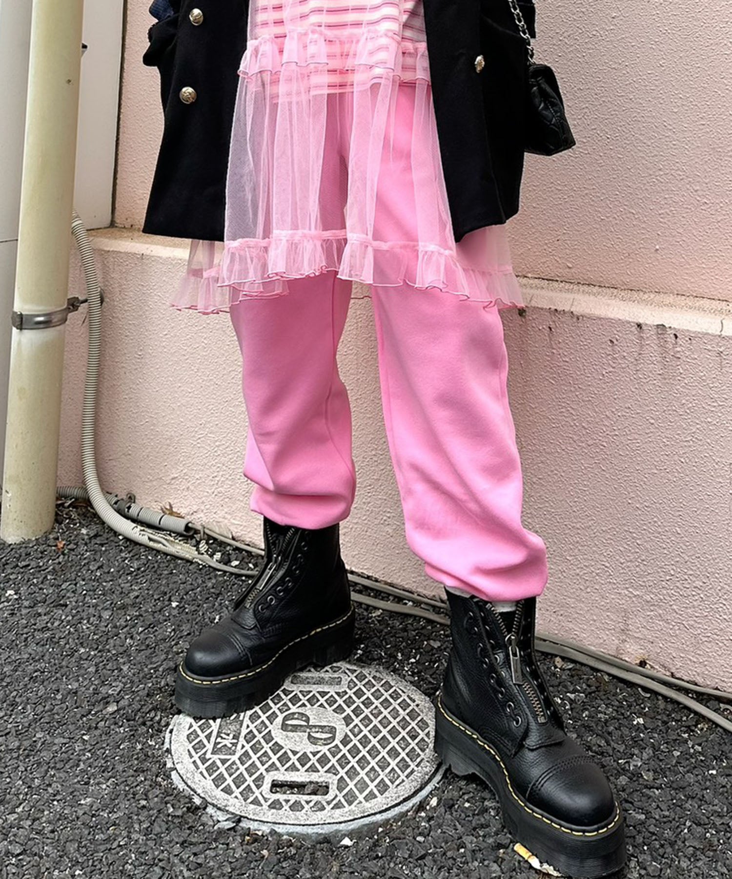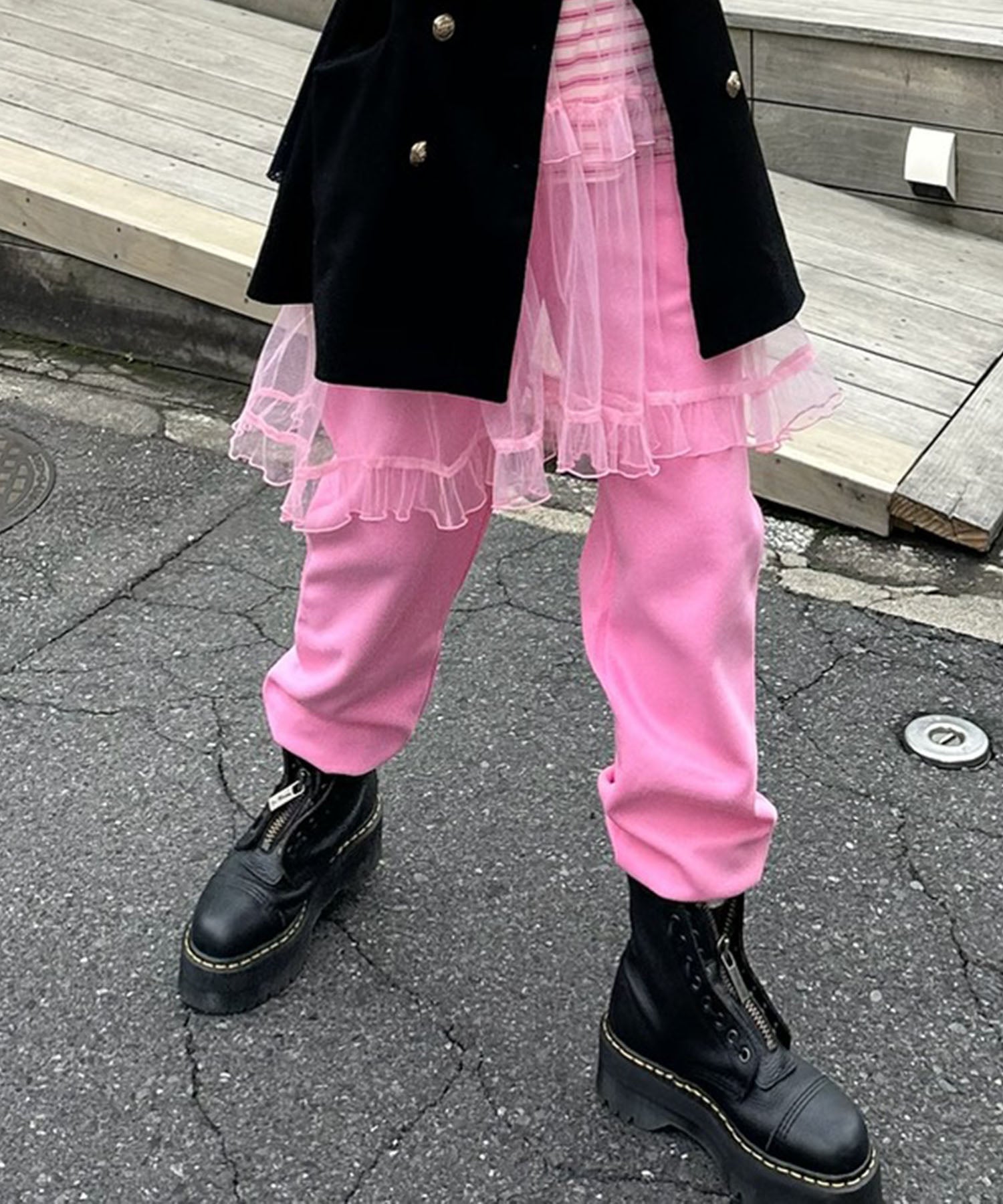 ・カジュアルなイージーパンツは、レースやフリルなど女子っぽアイテムと合わせるのがかわいい