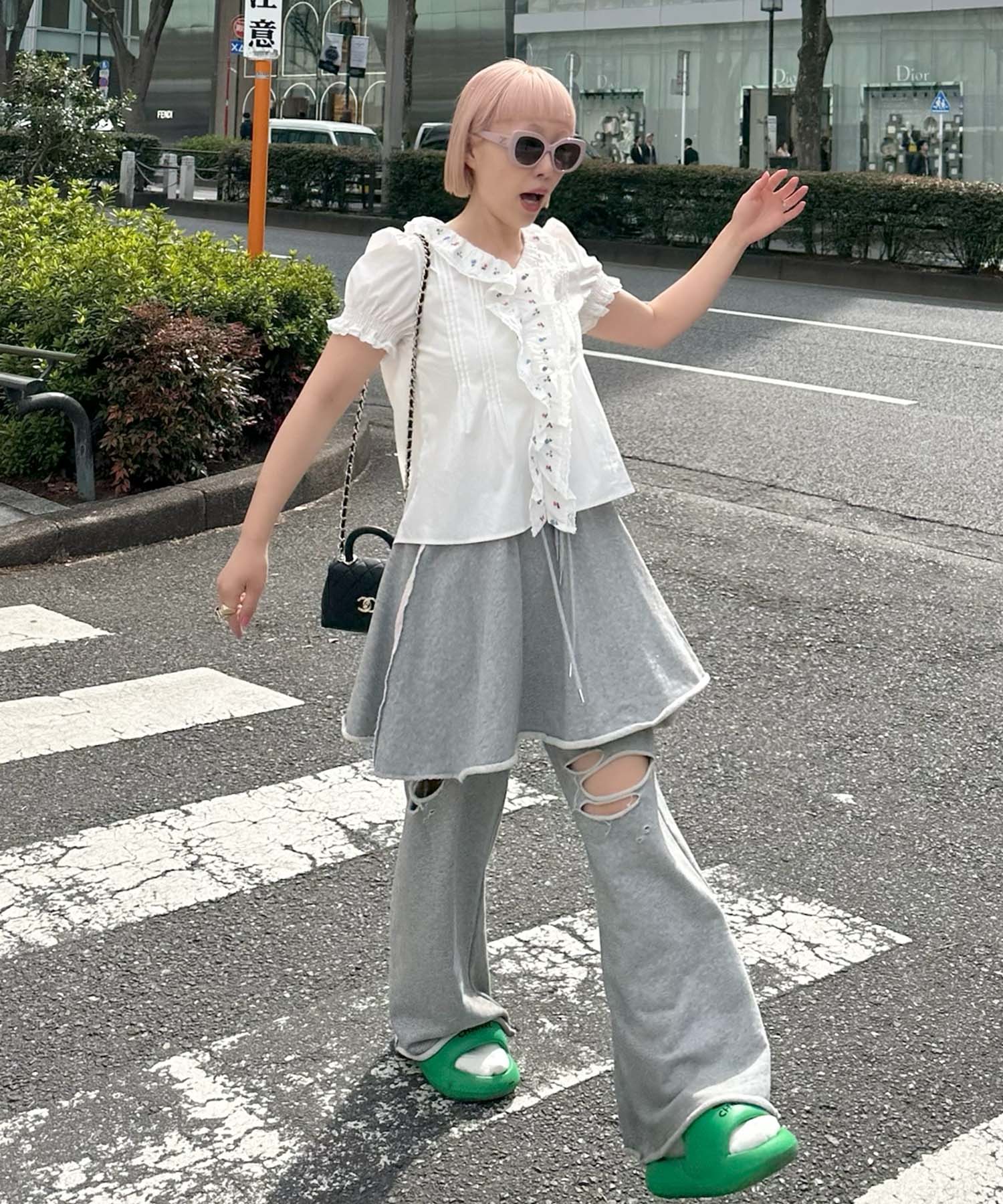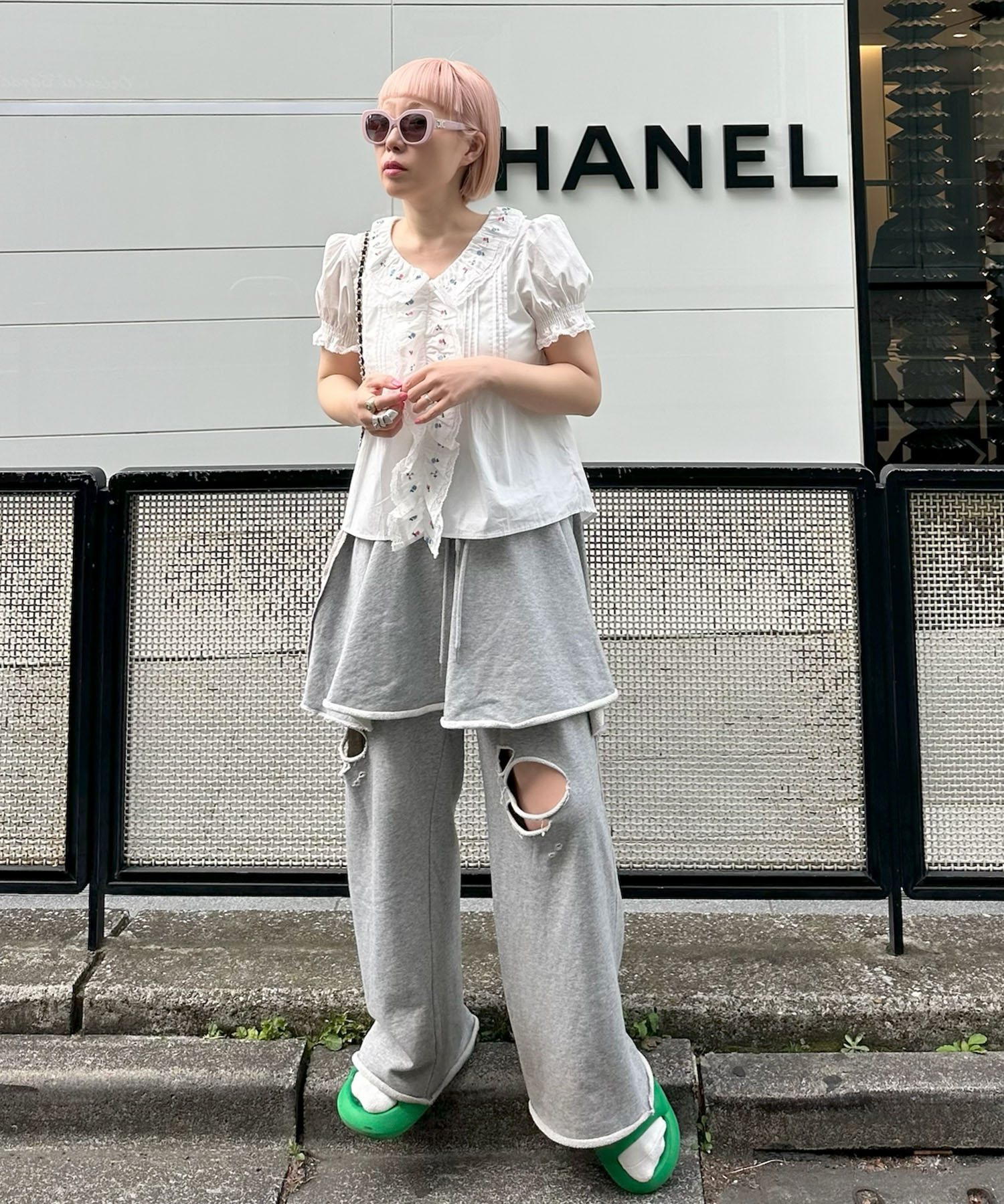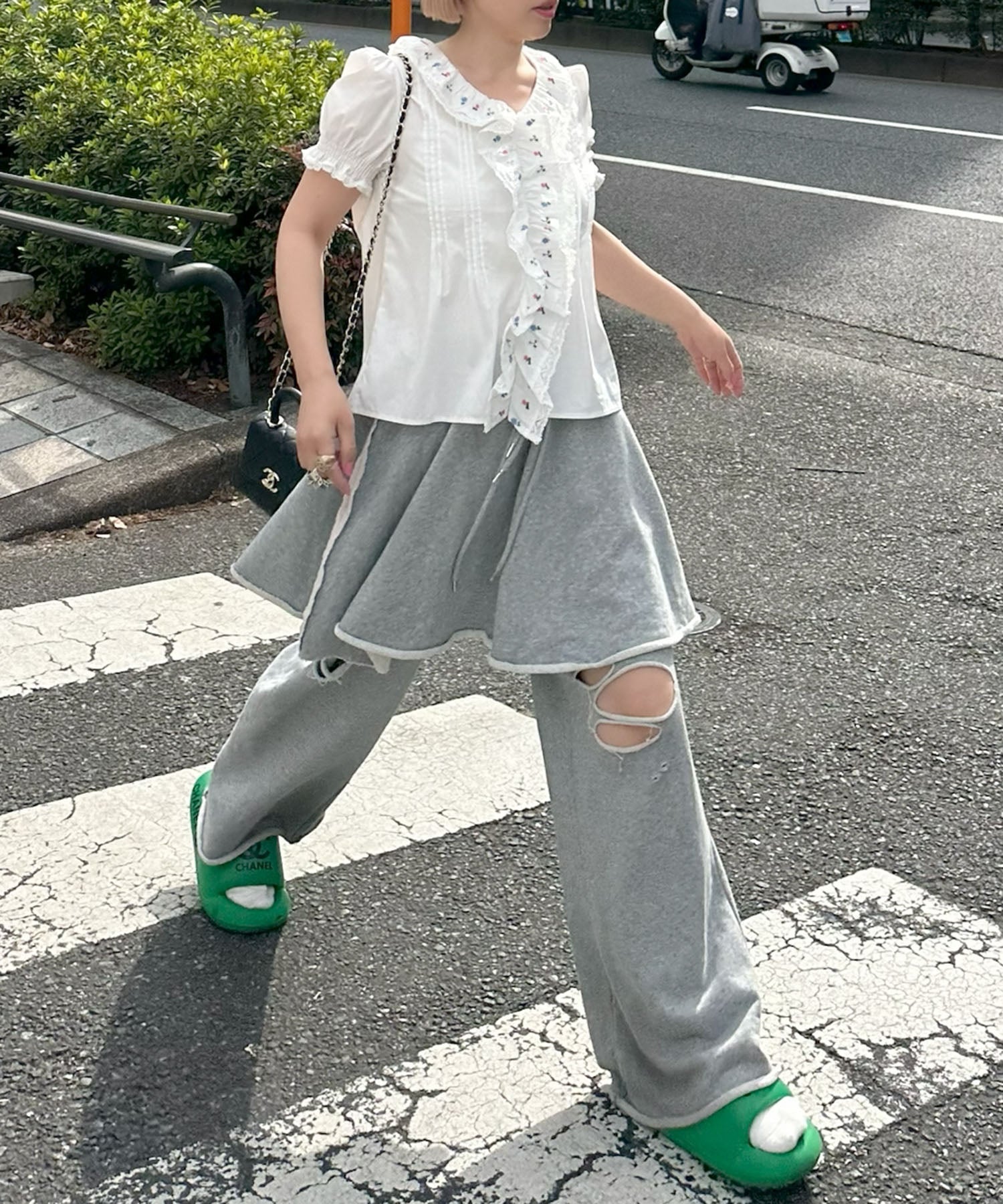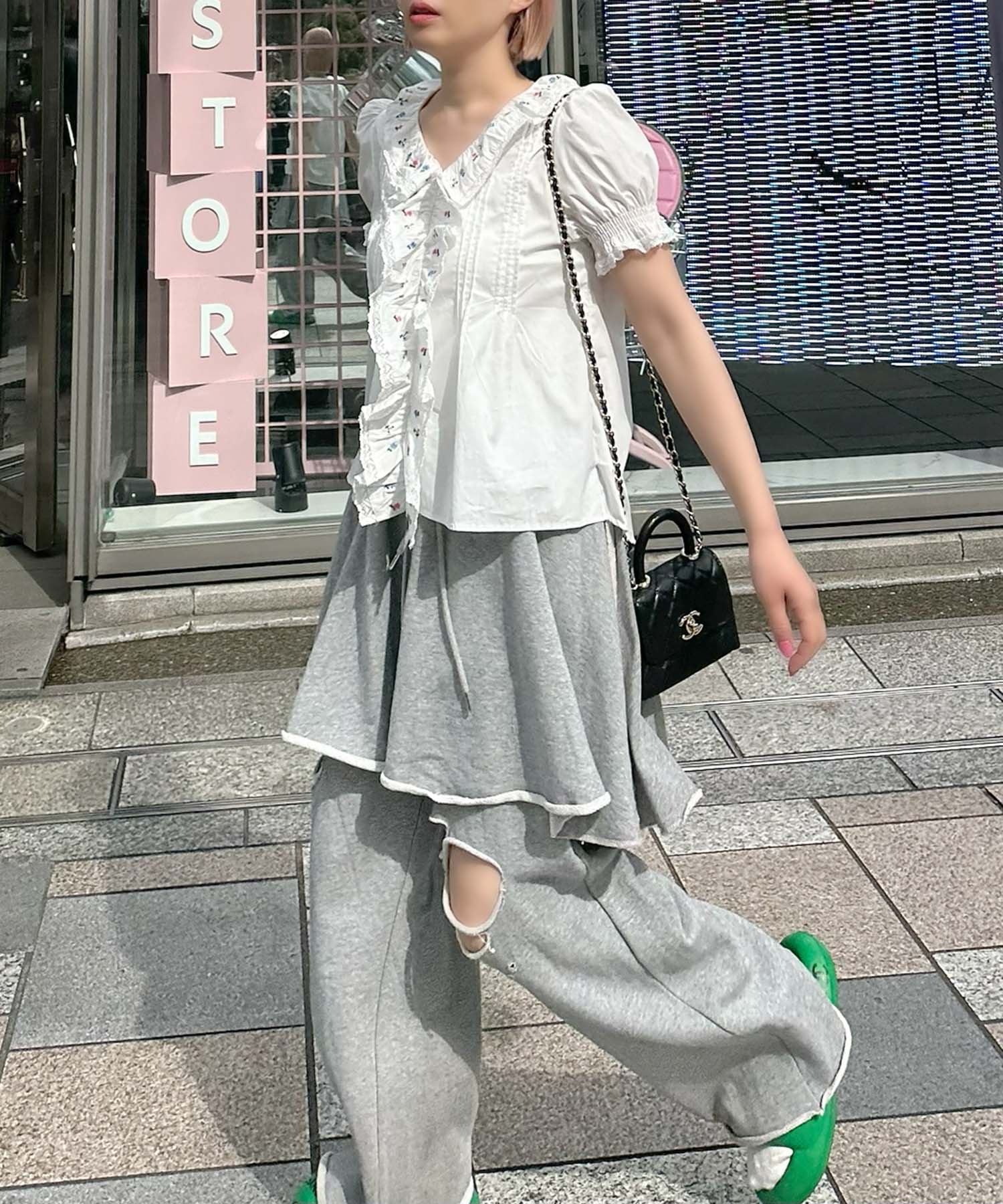 ・女子っぽブラウスは、カジュアルなイージーパンツやデニムと合わせるのが鉄板