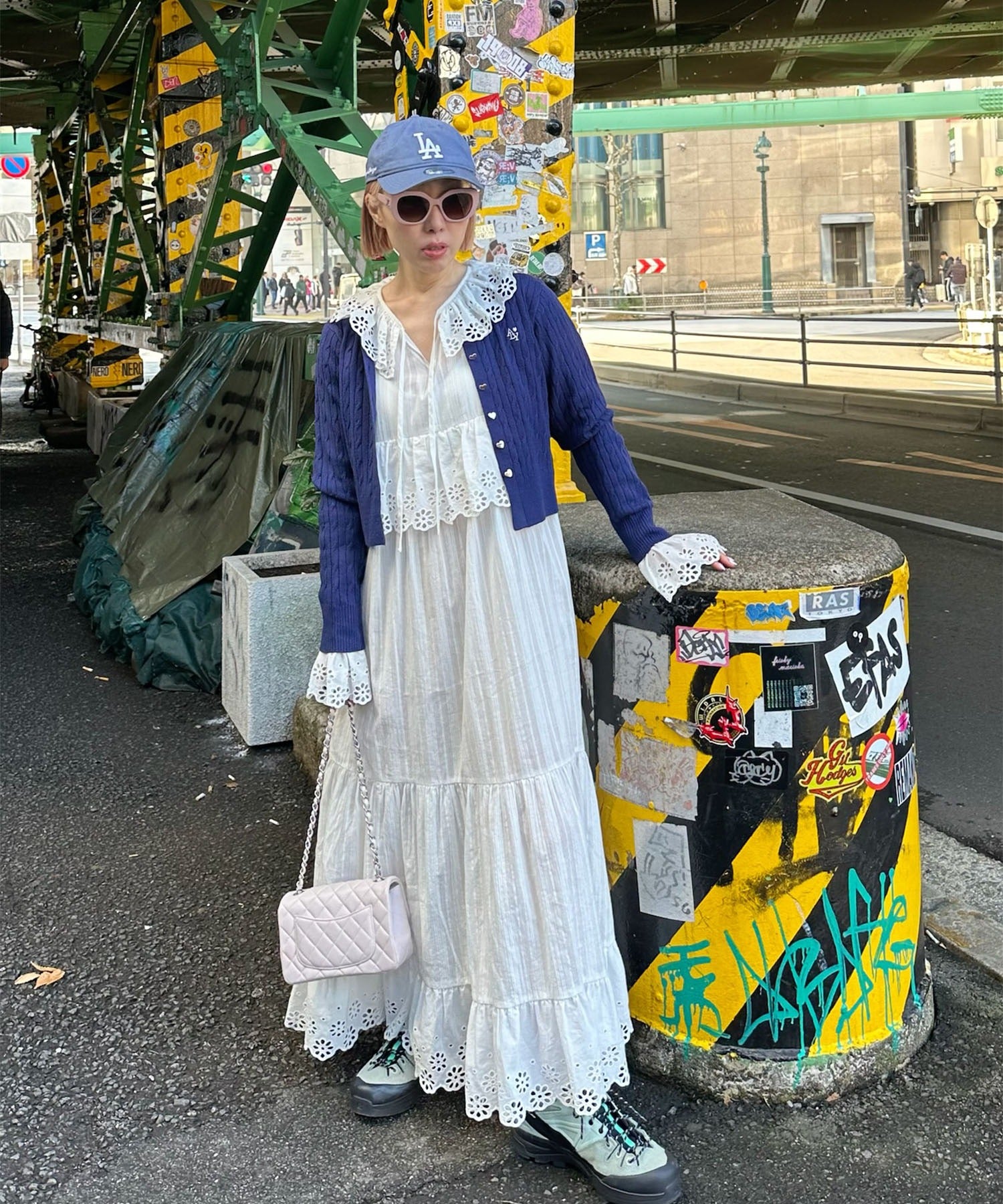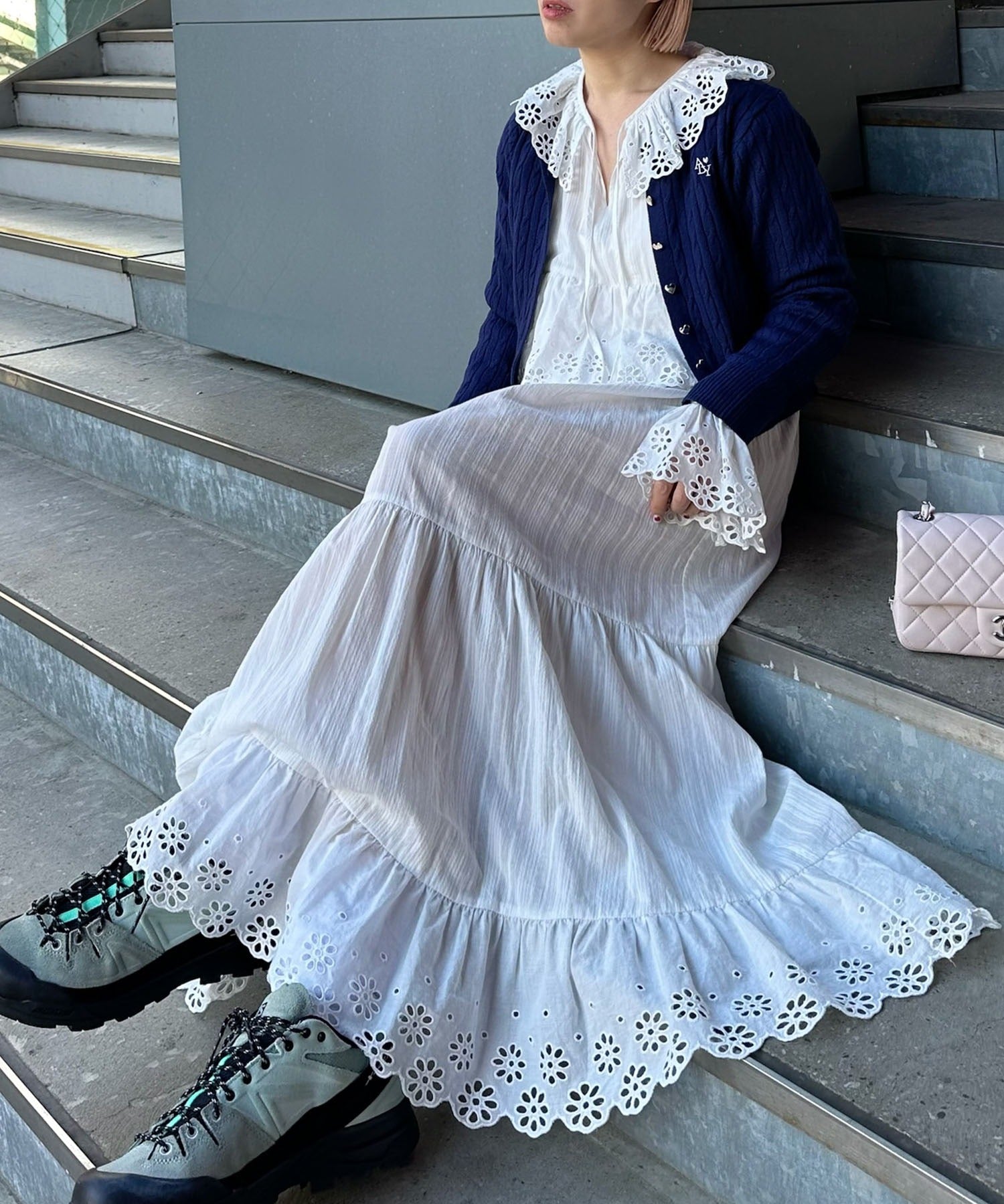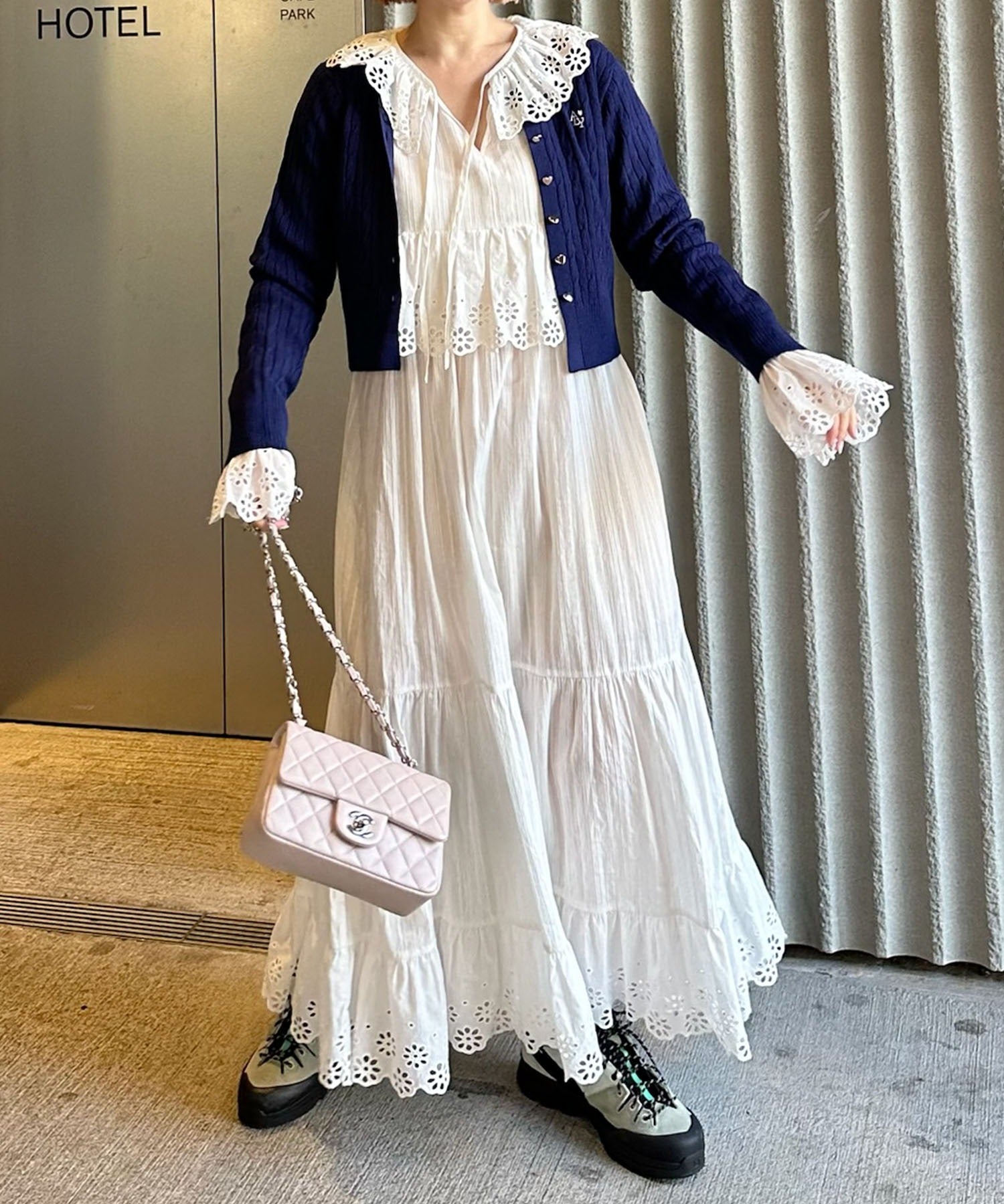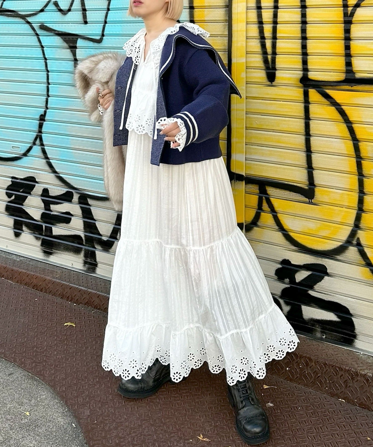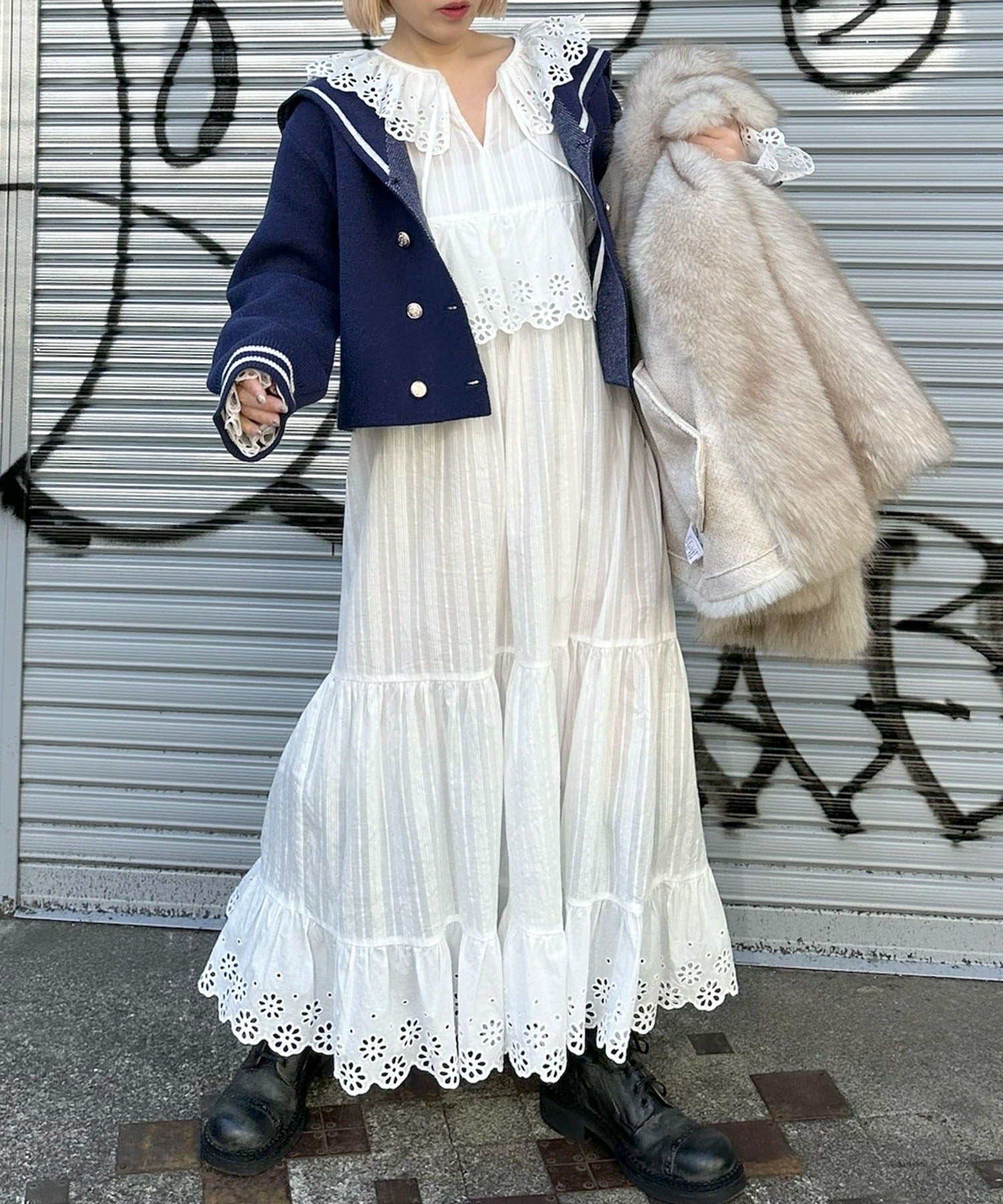 ・足元はボリューム感あるブーツを合わせると甘辛テイストでバランスの良いスタイリングに