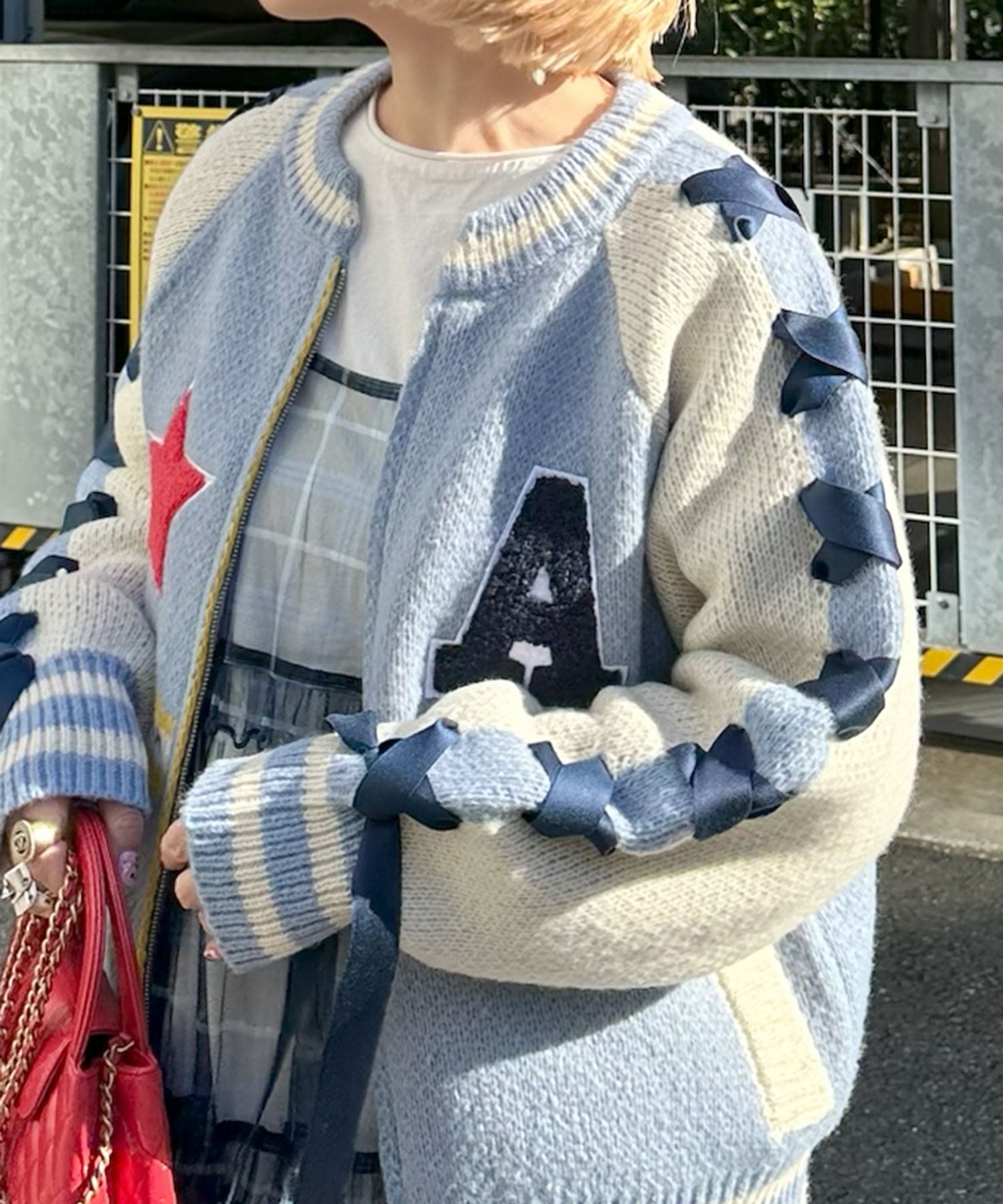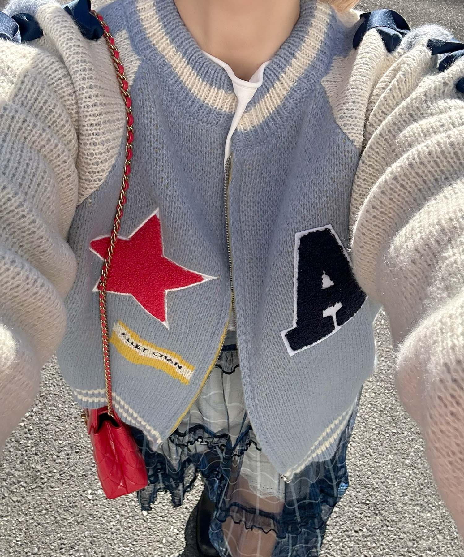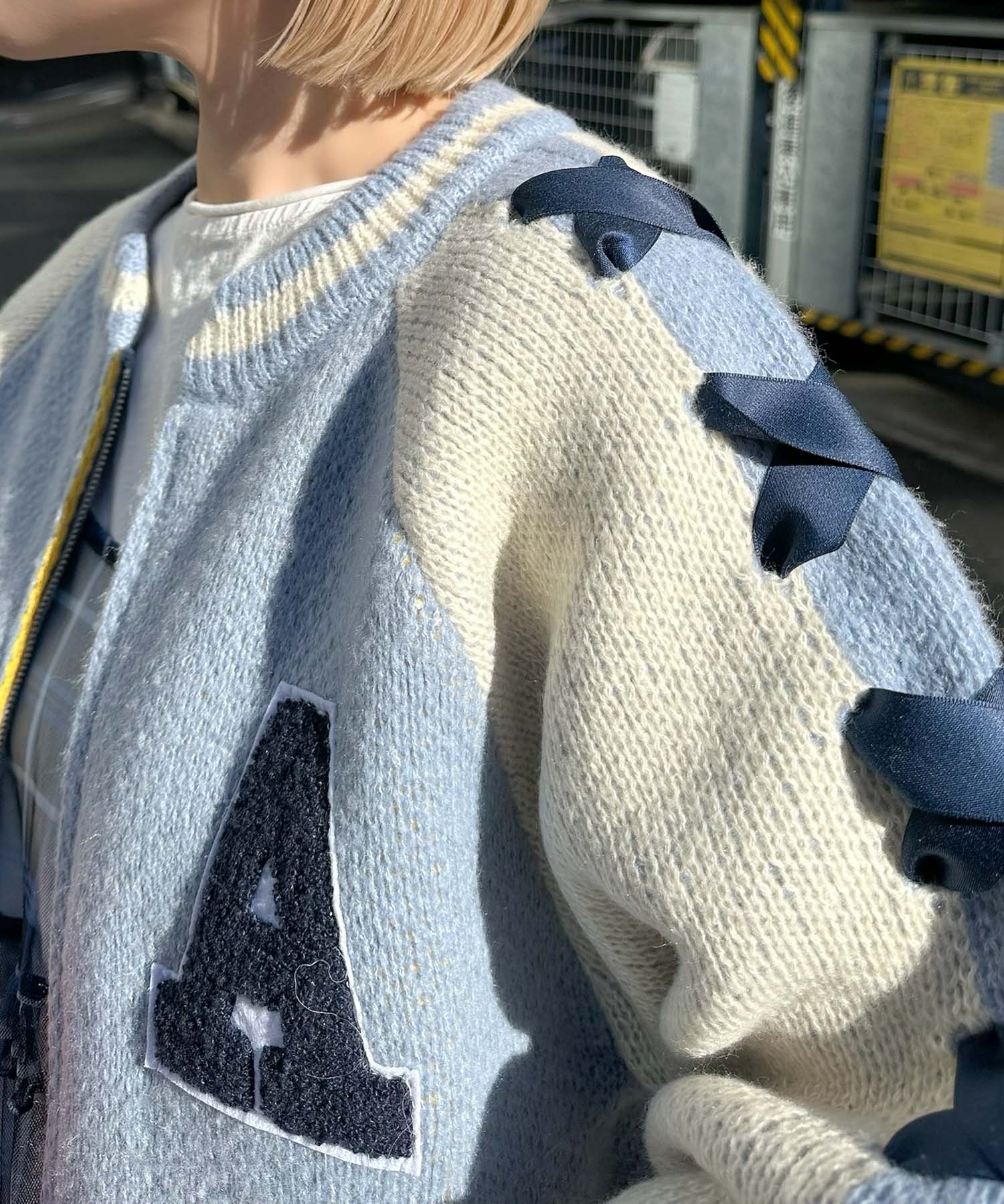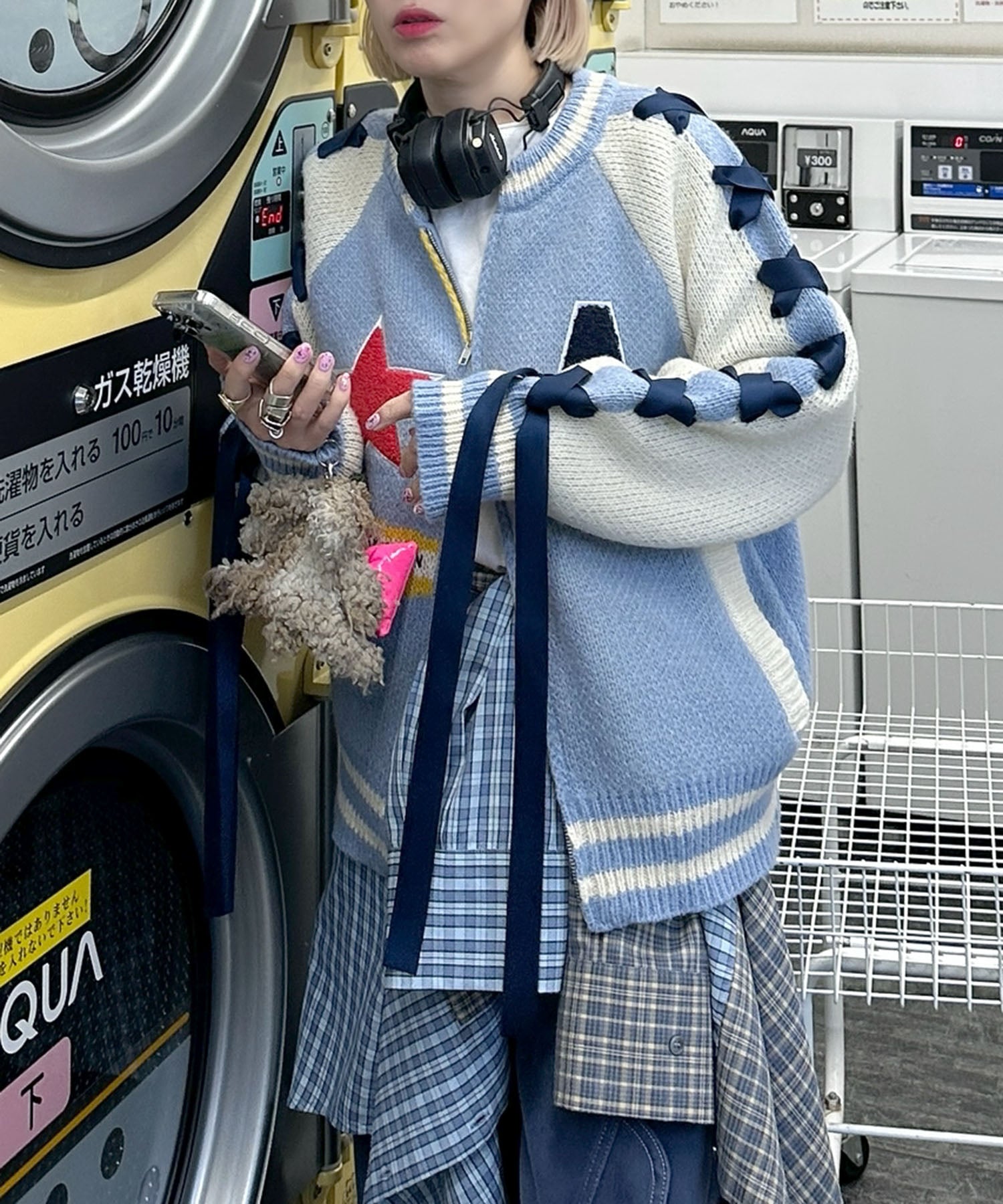 袖リボンALLEYニットスタジャン【サックスブルー】