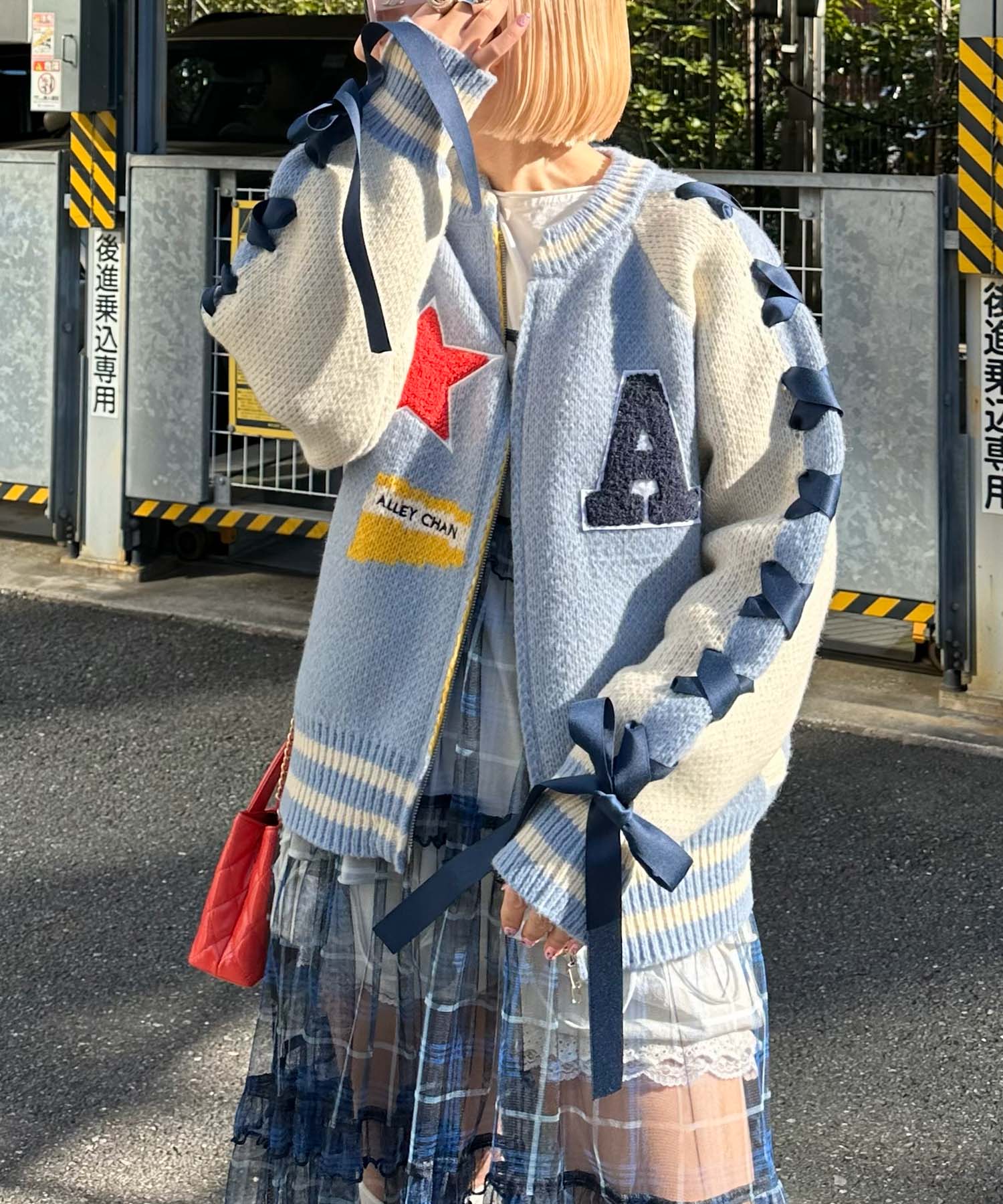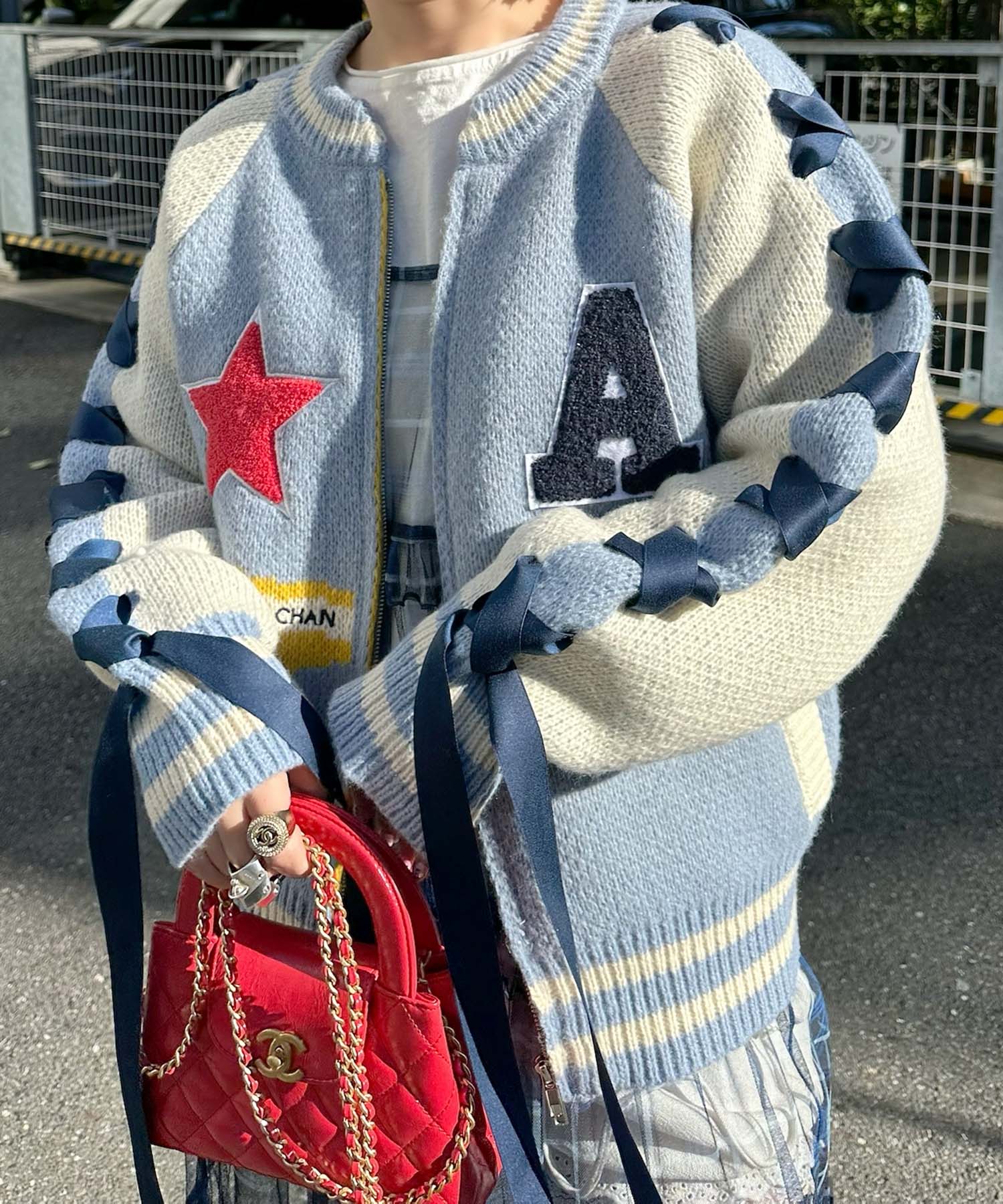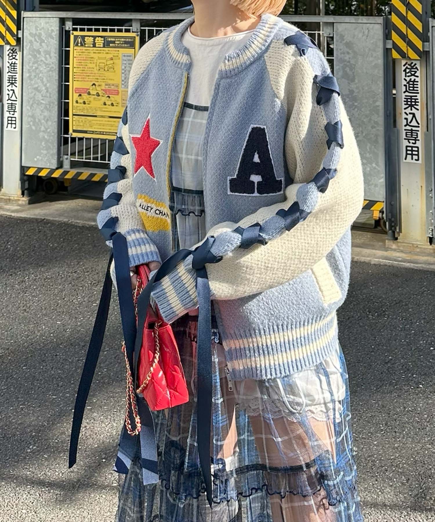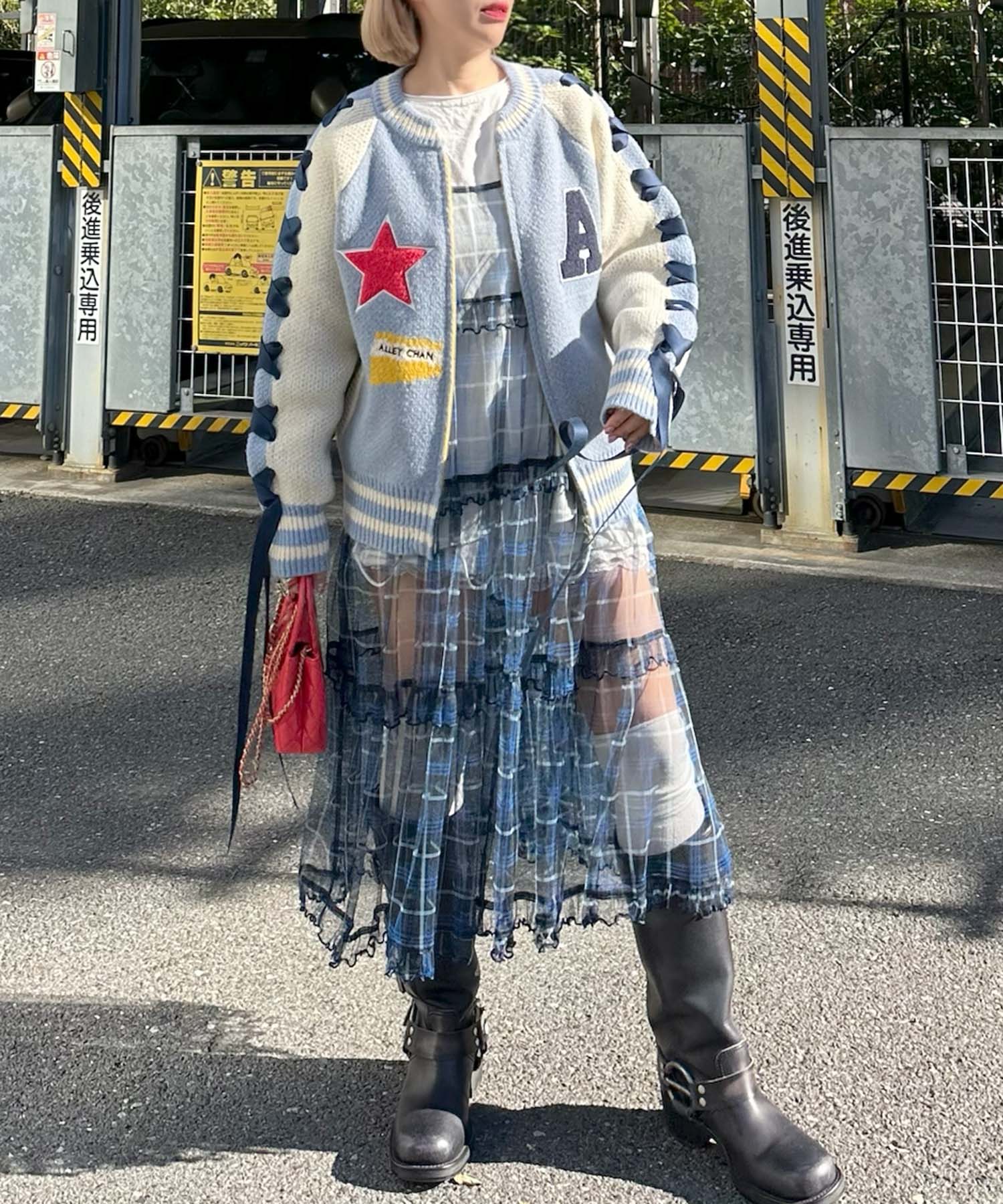 袖リボンALLEYニットスタジャン【サックスブルー】